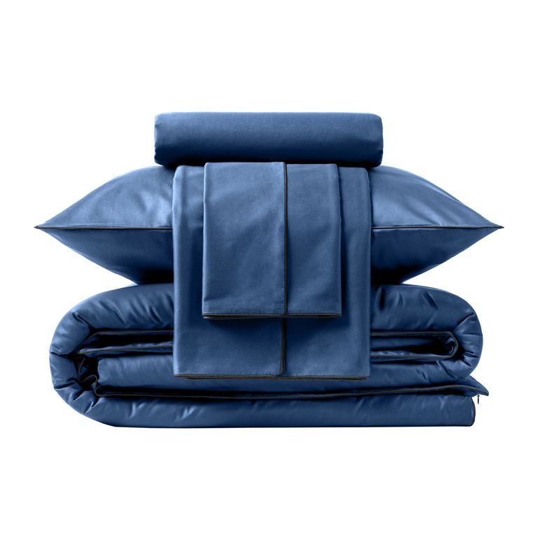 1,5 спальное: 1 простыня 180x215 см, 1 пододеяльник 148x215 см на молнии с кантом, 2 наволочки 50x70 см